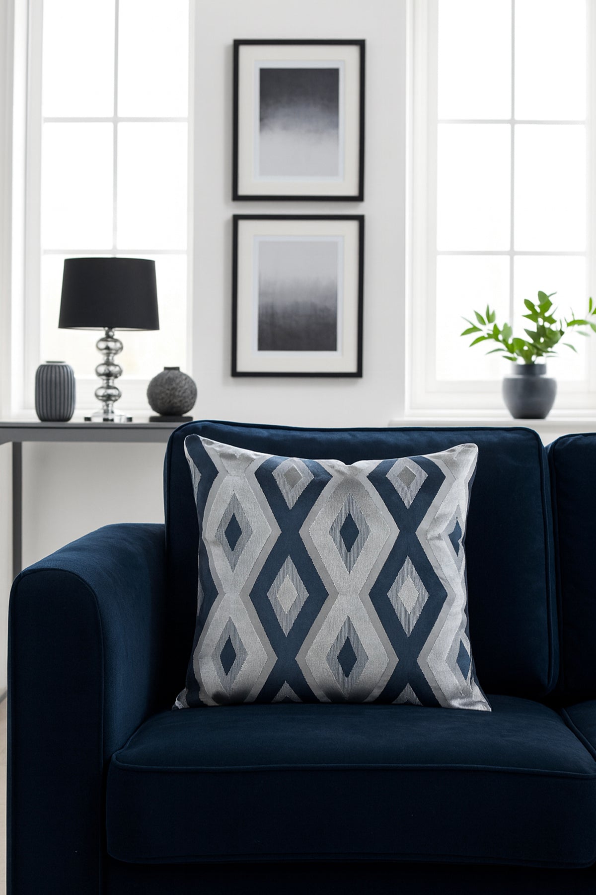 Desenli Kadife Kırlent Kılıfı Lacivert Gri 45x45